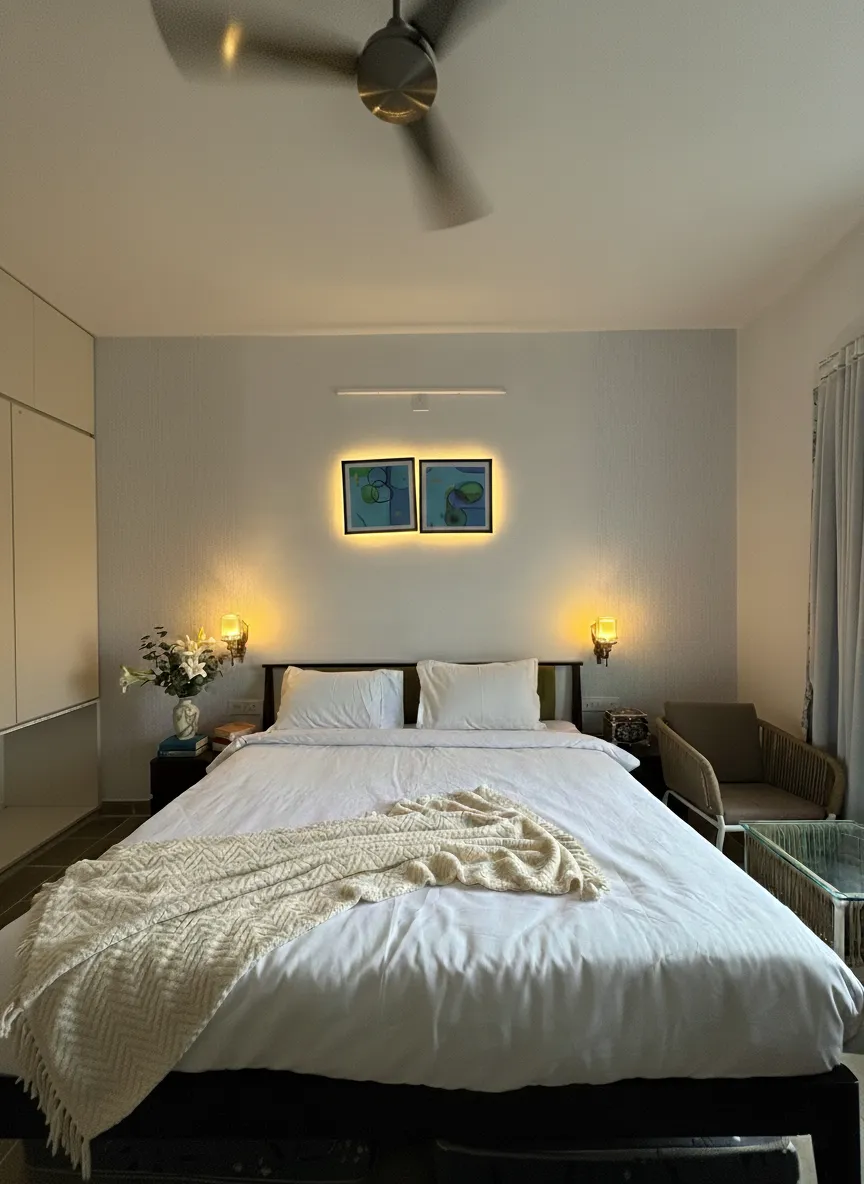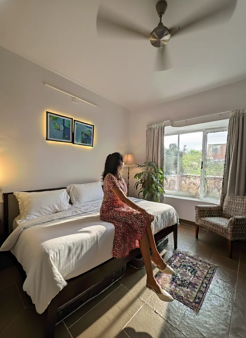 Perfectly planned interiors, elegant lighting, and cosy detailing make this 1 BHK villa in Udaipur refined, warm and inviting.