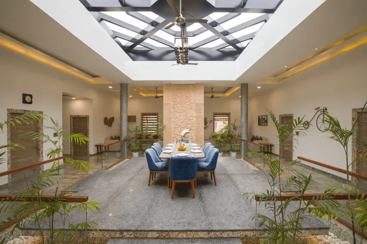 The interior of the villa consists of a bright living room, a properly organised dining room, and enough corners where the guests can sit and relax. It is perfect for large families or groups of people who want to have a luxury villa in Udaipur for New Year celebrations without losing privacy or comfort.