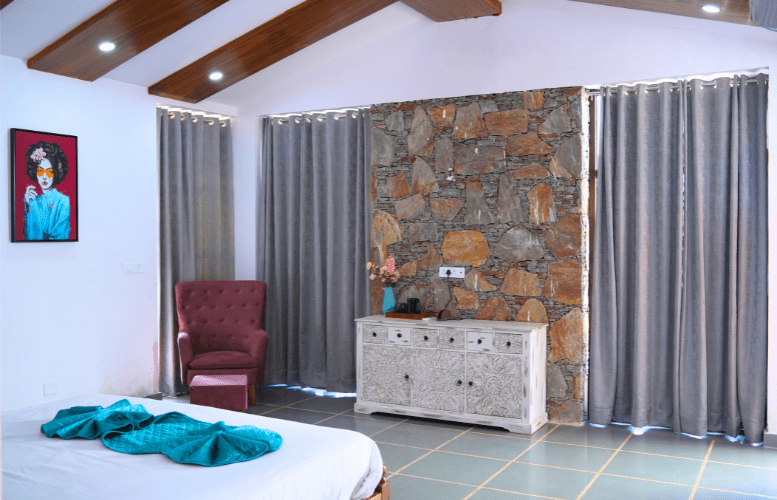 Ans. The luxury room of Goya Hills approximately covers 500 square feet of area. And if you talk about the whole villa, then Goya is the best villa in Udaipur, covering around 11000 square feet.